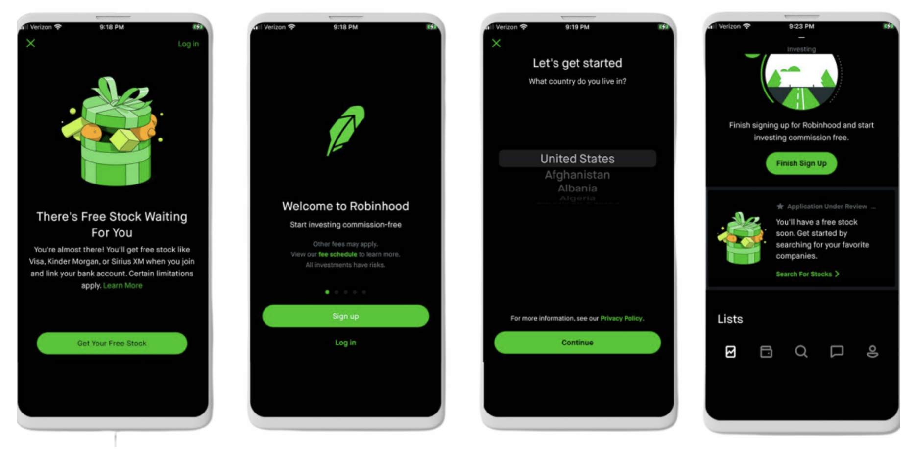 A good example here is Robinhood’s app, which has tackled the speed and friction challenge by not including the configuration stage of the account as part of the onboarding process. Instead, the configuration is optional and the user can opt to configure the account later. Similar to Chime, the app also requires only one piece of information per screen.